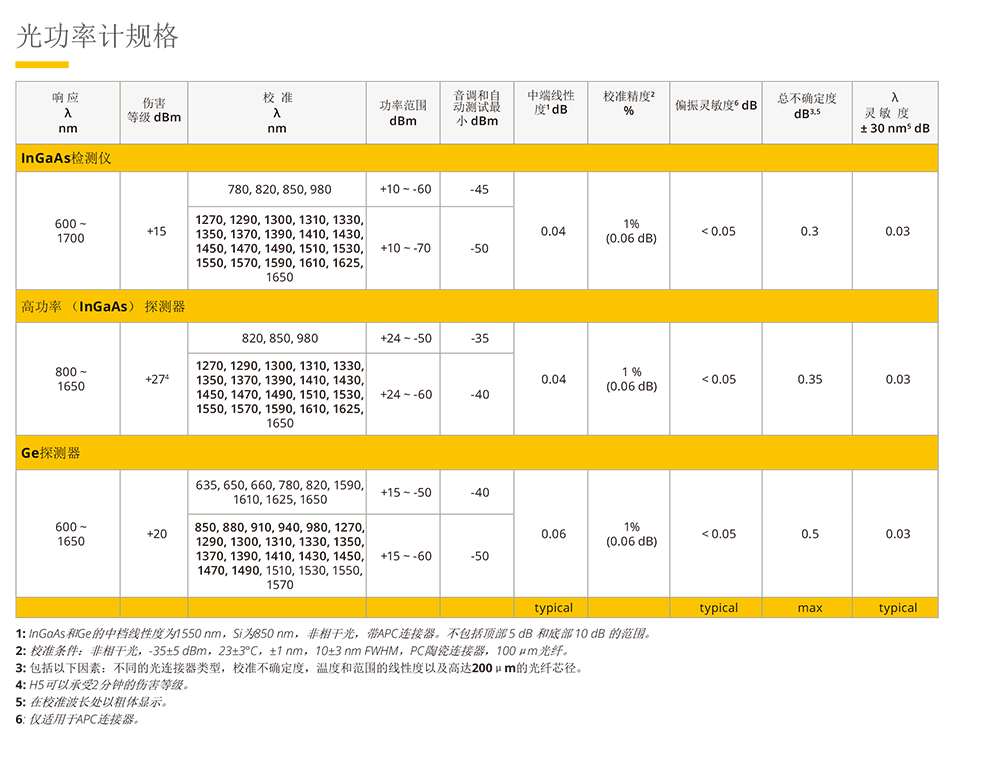 ? 標準InGaAs探測器,測量范圍為+10至-70dBm(適用于1270至1700標準電信波長,在850至1270nm范圍內具有良好的性能);