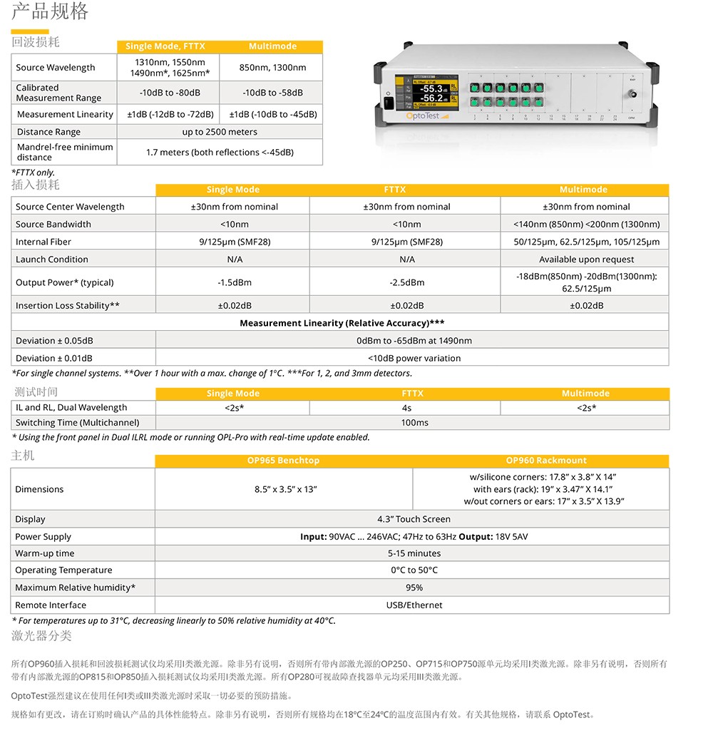 OptoTest的新型OP960系列光插入損耗和光回波損耗計(jì)以業(yè)界最快的RL儀表OP940系列久經(jīng)考驗(yàn)的功能為基礎(chǔ),具有更高的速度和增強(qiáng)功能,使其更易于使用。OP960具有更大、更清晰的觸摸屏、內(nèi)置以太網(wǎng)功能以及升級(jí)的外殼和組件,是尋求完整、簡(jiǎn)單、精確、占用空間小的測(cè)試解決方案的光纖電纜制造商的首選。
